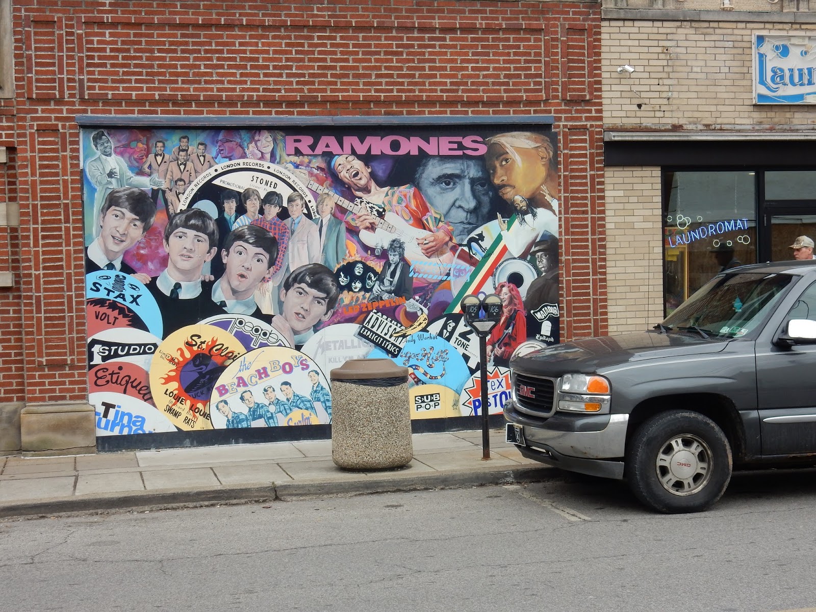 The store’s exterior features two great painted murals, pictured below (sorry during my visit that minivan just wouldn’t move). painted by Sandy Kessler. You can find a better picture of them (they got the minivan to move), along with an annotation of each person and label depicted, in this April 2020 post in Very Local Pittsburgh An Annotated Guide To The Attic Records Mural In Millvale, or you could just try to guess on your own.